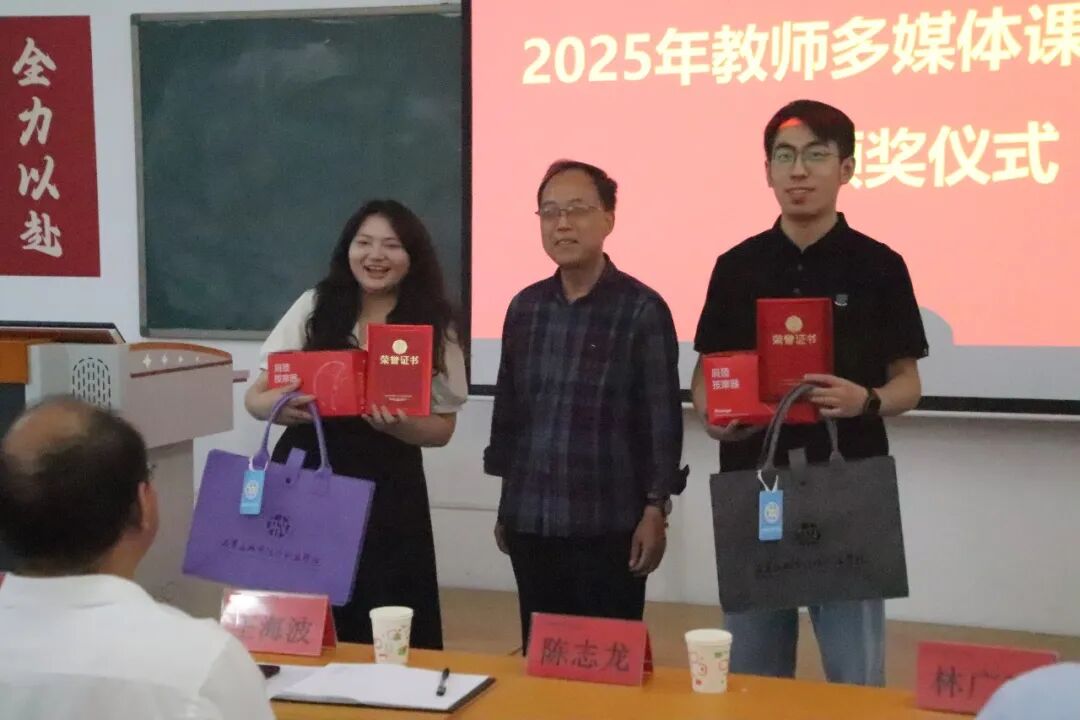 颁奖仪式上,嵇建珍发表讲话。他首先对获奖老师表示了祝贺,鼓励大家多参加此类教师大赛,在互动交流中提升自身业务水平,使自己更好更快成长起来。其次,针对此次大赛活动,成效显著,主要体现在:一是现代化,人工智能等现代化手段的运用,有效推动了教学手段和方法的变革。二是趣味化,选手们融入智慧,采用动画、配音等多种手段,大幅提升了课堂趣味性。三是科学化,围绕教学内容与课程性质设置教学手段,使其有效服务于教学及课堂教学能力的提升改善。